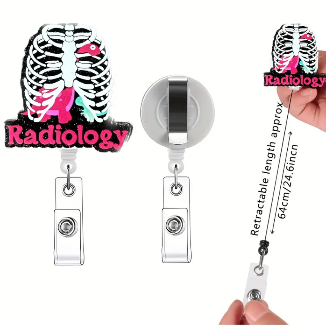 A Radiology badge reel symbolizes the essential role of radiologic technologists and radiologists in healthcare through diagnostic imaging techniques such as X-rays, MRIs, and CT scans. It represents a commitment to patient care, safety, and comfort during imaging procedures, as well as the technical expertise required to operate complex equipment.