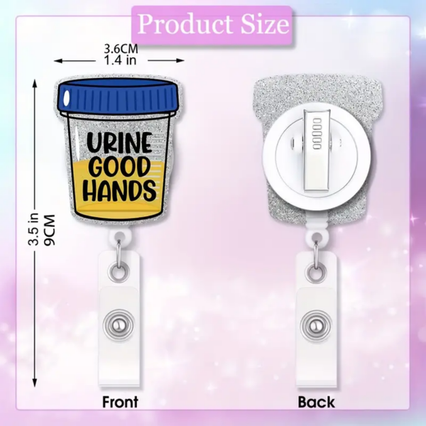 The "Urine Good Hands" badge reel symbolizes a sense of humor and lightheartedness often found in healthcare settings, particularly among professionals involved in urology, nephrology, medical technician or general patient care related to urinary health.
