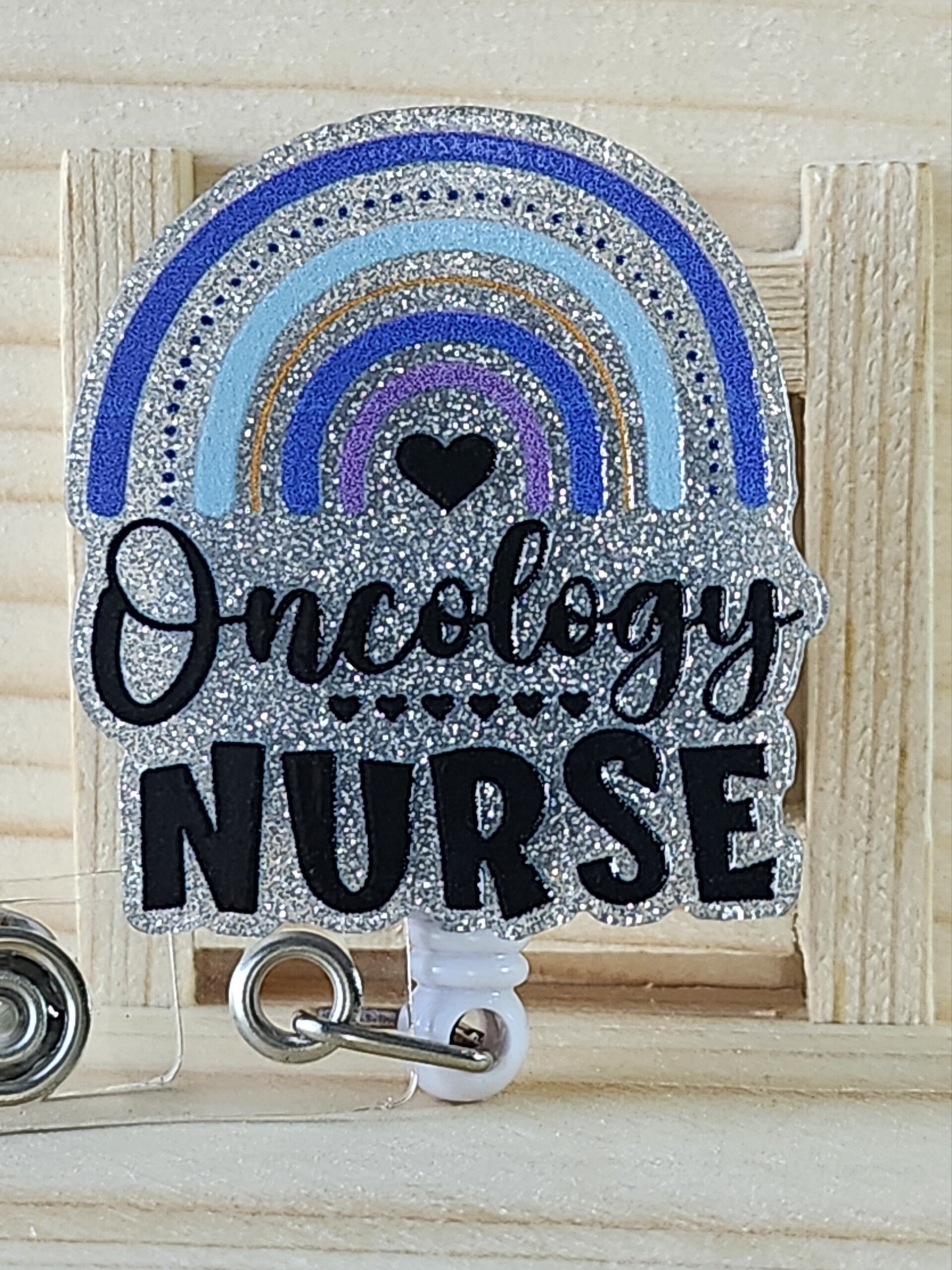 An Oncology nurse badge reel symbolizes the vital role of oncology nurses in caring for cancer patients. It represents compassion, resilience, and specialized knowledge in managing complex health issues related to cancer treatment.